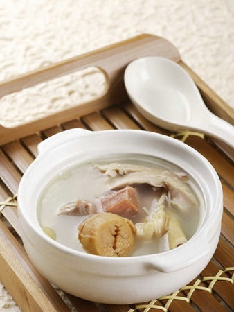 食疗体例5,海参乌鸡汤。发海参96克。乌骨鸡半只。龙眼肉35克。生姜2片。冬菇5枚。盐适量。煲汤。分2次温服。